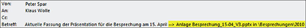 Damit Sie auch später noch zweifelsfrei nachvollziehen können, welche Anlage ursprünglich zu der E-Mail gehörte, dokumentieren Sie den Speicherort wieder wie zuvor beschrieben: