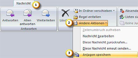 Wenn die E-Mail mehrere Anlagen enthält, können Sie diese in Outlook 2007 und 2010 mit dem Befehl Nachricht / Andere Aktionen / Anlagen speichern schnell in nur einem Vorgang lokal abspeichern (Bild 3). In Outlook 2002 und 2003 finden Sie den Befehl Anlagen speichern im Menü Datei der geöffneten E-Mail.