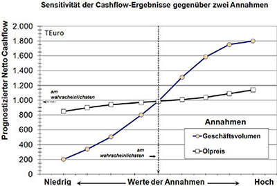 Aus dem Diagramm ist ersichtlich, dass der gesamte Cashflow sehr empfindlich auf Veränderungen des Geschäftsvolumens reagiert, während er relativ unempfindlich gegenüber einer Veränderung des durchschnittlichen Ölpreises ist. Die Kurven zeigen, was mit einem Ergebnis des Business Cases passiert, wenn sich eine Annahme ändert und alle anderen Annahmen konstant gehalten werden.