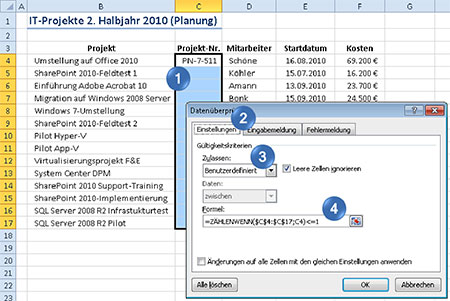 In einer Liste mit IT-Projekten – zu sehen in Bild 2 – möchten Sie in Spalte C jedem Projekt eine Nummer zuweisen. Excel soll dafür sorgen, dass jede Nummer nur ein einziges Mal vergeben werden kann. Geben Sie versehentlich eine Nummer zum zweiten Mal ein, verhindert Excel dies mit einem entsprechenden Hinweis.