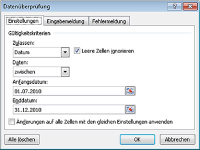 - Tragen Sie bei "Anfangsdatum" und "Enddatum" die entsprechenden Daten ein – für das Beispiel also 01.07.2010 und 31.12.2010 und schließen Sie Ihre Eingabe mit "OK" ab.