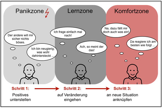 Werden wir plötzlich mit Neuem und Unbekannten konfrontiert, kann uns das aus unserer Wohlfühlzone mitten hinein in die Panikzone katapultieren. Unerwartete Situationen sind insbesondere in Projekten jedoch eher die Regel als die Ausnahme, z.B. wenn ein Auftraggeber mit einer zusätzlichen Anforderung um die Ecke kommt.