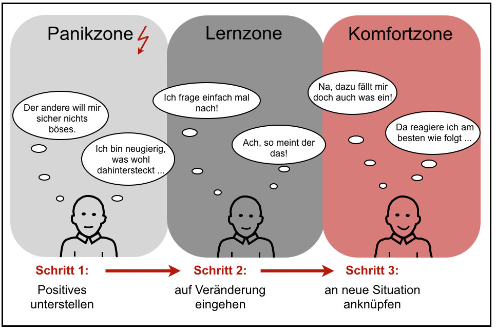 Die wenigsten Menschen wollen uns wirklich etwas Böses. Wir glauben das nur manchmal, wenn sie unwirsch, ärgerlich, aggressiv oder beleidigend auf uns wirken. Viel häufiger ist es aber so, dass sie z.B. wegen Stress überreagieren. Manche Menschen sind generell nicht besonders einfühlsam und sprechen Dinge einfach nur ungeschickt an. Das "positive Unterstellen" unterstützt Sie dabei, von einem positiven Kern in der unwirschen Ansprache des anderen auszugehen. Die positive Haltung ist der erste Schritt, um aus der Panikzone gezielt in die Komfortzone zurückzusteuern.