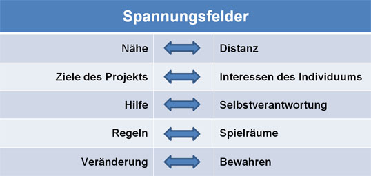 - Worauf sollte die Projektleitung achten, um die rechte Balance innerhalb eines Spannungsfeldes zu erreichen?