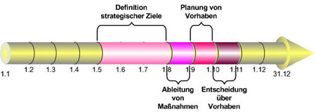 Ein solcher Planungsprozess ist in Bild 1 dargestellt. Das Geschäftsjahr deckt sich in dieser Darstellung mit dem Kalenderjahr, kann aber genauso gut ein anderer Zeitraum sein (z.B. 1.10. bis 30.09.). Ferner sind die Phasen nicht strikt getrennt voneinander zu sehen, sondern können sich überlappen.