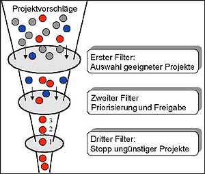 Aufgabe des strategischen Projektcontrollings ist es, Informationen für die Bewertung der Projektvorschläge bereitzustellen und damit die Entscheidung über die Auswahl, den Freigabezeitpunkt und u.U. den Abbruch von Projekten zu unterstützen. Bild 1 zeigt dafür einen dreistufigen Filter. Filter eins legt anhand der strategischen Bedeutung, des Risikos und der Wirtschaftlichkeit die zu realisierenden Projekte fest, Filter zwei priorisiert die Projekte und bestimmt damit auch deren Anfangstermin. Filter drei überprüft die laufenden Projekte permanent darauf, ob sie weiterhin bearbeitet werden sollen.