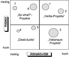 Die Unternehmensberatung Arthur D. Little schlägt ein Projektportfolio vor, um die vielversprechendsten Entwicklungsvorschläge zu identifizieren [1]. Beurteilungsmaßstab ist das Verhältnis von Attraktivität und Risiko (vgl. Bild 2). Die Kreisgröße in Bild 2 gibt den Anteil eines Projekts am Projektbudget wieder.