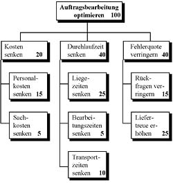 Die Suche nach Zielideen kann mit Kreativitätstechniken unterstützt werden. Grundsätzlich sind Leistungs-, Kosten- und Terminziele zu unterscheiden. Auch eine Unterteilung in finanzielle, kunden- und prozessbezogene Ziele kann sinnvoll sein. Die gefundenen Ziele sollte man in Ober- und Unterziele strukturieren (vgl. Bild 2).