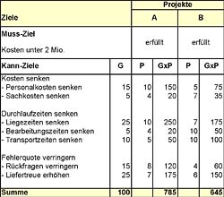 Man kann nicht alle Ziele in der gleichen Intensität verfolgen. Deswegen ist eine Gewichtung der verschiedenen Teilziele sinnvoll. Dies bedeutet in einem ersten Schritt die Festlegung von Muss- und Kann-Zielen. Die Kann-Ziele sind differenziert zu bewerten. Dazu reicht bei einfachen Zielstrukturen eine direkte Gewichtung wie in Bild 2 aus.