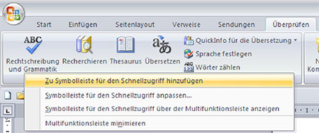 Befindet sich der Befehl in der Multifunktionsleiste, können Sie diesen mit zwei Klicks zur Symbolleiste hinzufügen. Angenommen Sie möchten den Befehl "Rechtschreibung und Grammatik" in die Symbolleiste aufnehmen. Gehen Sie in den Reiter "Überprüfen", fahren Sie mit der Maus auf den Befehl, klicken Sie einmal mit der rechten Maustaste und wählen Sie "Zu Symbolleiste für den Schnellzugriff hinzufügen" aus (Bild 3). Der Befehl erscheint nun rechts in der Symbolleiste.