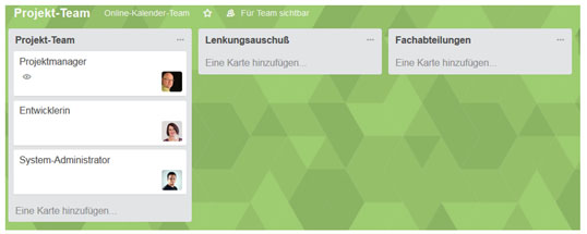 Um die Kommunikation in der Kennenlernphase des frisch zusammengestellten Teams reibungslos zu gestalten, empfiehlt es sich, ein zusätzliches Team-Board einzurichten. Für einzelne Personen erstellen Sie dazu Karten. Handelt es sich um ein größeres Team, bietet es sich an, die Karten zusätzlich rollenbasiert innerhalb von Listen zu organisieren, z.B. Projektleitung, PMO, Entwickler, System-Administratoren usw. (Bild 1).