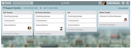 Für Abhilfe kann hier die Einrichtung eines Boards, dem "IT-Support-System" für das Projektteam, sorgen. Auf diesem Board werden alle relevanten Informationen zur IT an einer Stelle gesammelt, sodass sie für jedes Teammitglied verfügbar sind (siehe Bild 2).
