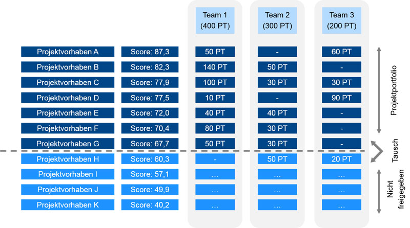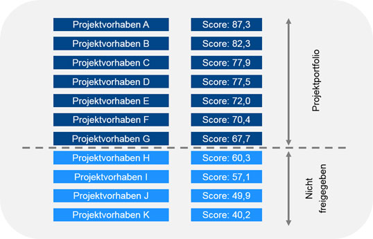 Bild 1: Priorisierung von Projektvorhaben mittels Scoring, dunkelblau eingefärbt sind gemäß vorliegendem Scoring freigegebene Projektvorhaben