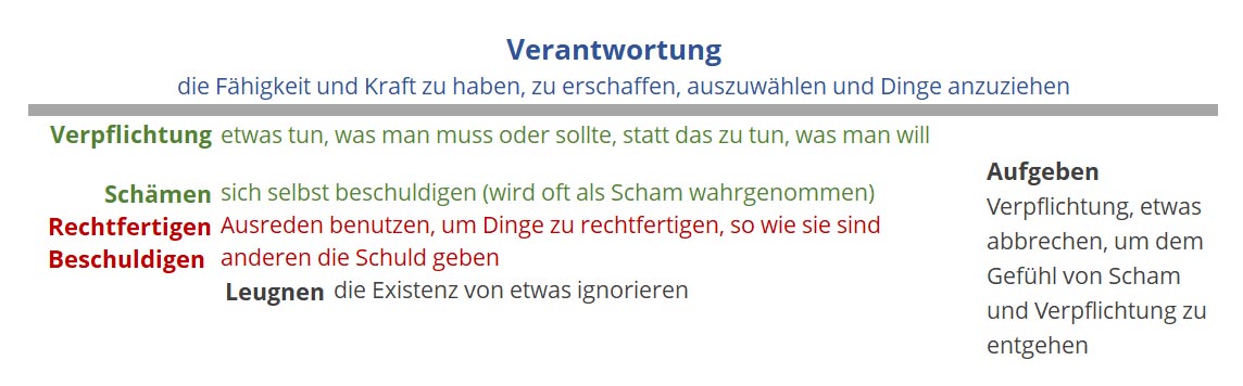 Diese mentalen Zustände, die Avery beschreibt, sind in uns allen vorhanden, und es ist vollkommen menschlich, diese zu durchlaufen. Manchmal stecken wir in einem Zustand fest, manchmal verweilen wir nur sehr kurz in einem Zustand. Das Ziel ist, sich in den Zustand der Verantwortung zu bewegen – einen Zustand, in dem wir voller Optionen und Kraft sind und Dinge aus eigenem Antrieb heraus tun. Dort fühlen wir uns kraftvoll und voller Optionen. Die anderen Zustände unterhalb der Linie können Etappen in Richtung Verantwortung sein.