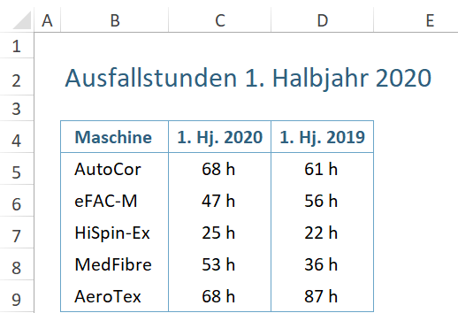 Bild 2 zeigt die Ausgangsdaten für das hier verwendete Beispiel: Ein Vergleich der Ausfallstunden von fünf Maschinen. Die Stunden im aktuellen Jahr stehen in Spalte C, die vom Vorjahr in Spalte D. Zur besseren Lesbarkeit erhielten die Stundenwerte in den Spalten C und D über den Befehl Zellen formatieren das benutzerdefinierte Zahlenformat 0 "h".