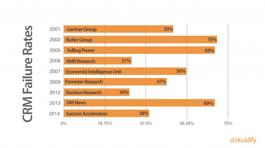 Vielfältige Untersuchungen gibt es auch zur Implementierung von CRM-Projekten. Die nachfolgende Grafik (Bild 2) zeigt die Ergebnisse einer übergreifenden Studie [1]. Die Autoren stellten fest, dass zwischen 30 und 70% aller CRM-Projekte scheitern.