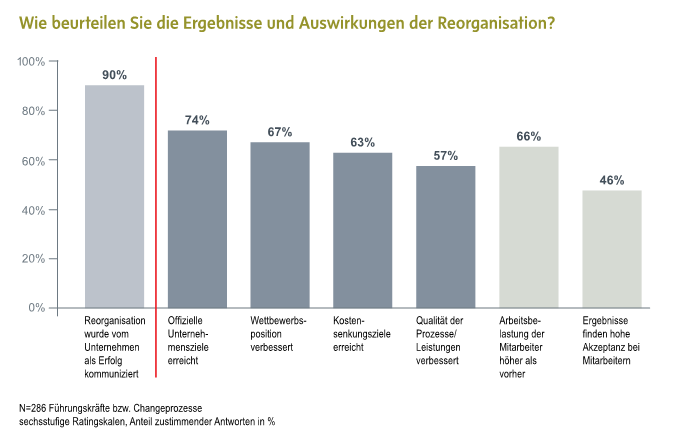Doch wie viele Projekte scheitern in der Realität wirklich? Kriegesmann [2] untersuchte in einer branchenübergreifenden Querschnittserhebung (Bild 1) 286 Veränderungsprozesse in Bezug auf die Ergebnisse und die Auswirkungen auf die Unternehmen und die Belegschaft. Von Unternehmensseite wurden 90% der Projekte " als Erfolg" bewertet. Die Detailanalyse lieferte aber ein anderes Bild. Bei 54% der Mitarbeiter fanden die Ergebnisse der Reorganisation keine Akzeptanz, und 66% nahmen nach der Reorganisation eine höhere Arbeitsbelastung wahr. Auch die harten Ziele, wie die Stärkung der Wettbewerbsposition, Kostensenkungen und die Verbesserung der Prozessqualität, wurden nur zum Teil erreicht, so die Studie (Bild 1).