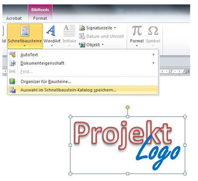 Fügen Sie zunächst das entsprechende Bild ein und formatieren Sie es nach Ihren Vorstellungen. Markieren Sie im Anschluss das Bild, rufen Sie den Befehl Einfügen / Schnellbausteine auf klicken Sie auf "Auswahl im Schnellbaustein-Katalog speichern" (Bild 1).