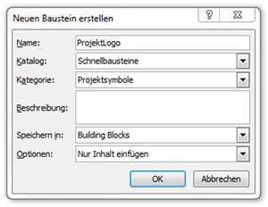 Geben Sie dem Schnellbaustein jetzt nur noch einen passenden Namen, erstellen Sie auf Wunsch eine neue Kategorie und achten Sie darauf, dass unter "Speichern in" die Datei "Building Blocks" aktiviert ist (Bild 2). Beenden Sie mit OK.