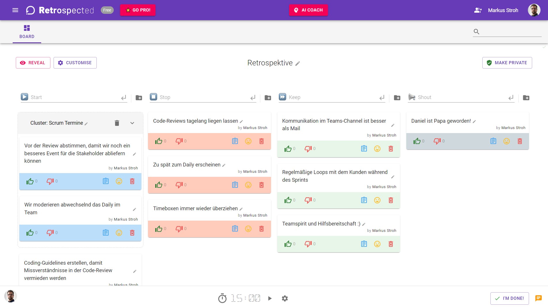 Sie können das Format im Präsenzmeeting vor Ort mittels Karten und Pinnwänden gestalten. Alternativ lässt es sich remote mithilfe digitaler Kollaborationstools wie Miro oder Retrospected umsetzen. In letzterem Tool hat die moderierende Person die Möglichkeit, die Karten in der Brainstorming-Phase unkenntlich zu machen und sie erst über die Funktion "Reveal" aufzudecken, wenn alle ihre Beiträge verfasst haben. Voting-Mechanismen als Entscheidungsgrundlage für die wichtigsten Retro-Ergebnisse steigern als soziale Komponente die Interaktion der Teilnehmenden. Wer den Prozess einfach halten möchte, kann vereinbaren, dass es nur positive Votes geben und jede:r Teilnehmende z.B. fünf "Daumen hoch" für die wichtigsten Diskussionspunkte vergeben darf. Am Ende der Retrospektive können Sie die Themencluster sortieren und den Entwurf aus dem Tool zur Dokumentation exportieren.