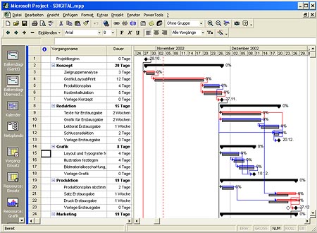 Die Planungsunterlagen sind erstellt und überprüft, das Kick-Off-Meeting ist vorbei, jetzt kann die Umsetzungsphase beginnen. Den Projektfortschritt kontrollieren Sie im Überwachungsdiagramm unter Ansicht / Balkendiagramm: Überwachung. Im Unterschied zum Balkendiagramm sehen Sie dort auch den Basisplan in Form kleiner grauer Balken unter den Vorgangsbalken (Bild 1). Wird ein Vorgang wie geplant abgeschlossen, bleiben die Balken deckungsgleich. Ändert sich der Termin eines Vorgangs, werden dieser und alle anderen Vorgänge, die von ihm abhängen, vom Basisplan abweichen.