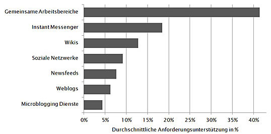 Newsfeeds (8%), Weblogs (6%) und Microblogging-Dienste (4%) kommen dagegen aktuell offenbar in Projekten kaum zur Anwendung. Eine Übersicht über die Bewertung der einzelnen Systeme durch die Umfrageteilnehmer ("Anforderungsunterstützung") zeigt Bild 2. Die Werte geben an, wie gut die einzelnen SCS die nachfolgend beschriebenen Anforderungen unterstützen.