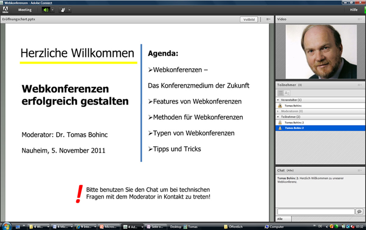 Vor der Konferenz versendet der Moderator per E-Mail eine Einladung. Diese enthält nicht nur den Termin der Webkonferenz, sondern auch einen Hyperlink zum Webkonferenz-System sowie den Zugangscode, mit dem sich die Teilnehmer zum genannten Termin einloggen können. Nach dem Log-in sehen die Teilnehmer den Eröffnungsbildschirm des Moderators (Bild 1). Dieser Startbildschirm kann z.B. Informationen enthalten wie das Thema der Konferenz, die Agenda, eine Teilnehmerliste oder erste Beiträge im Chat.