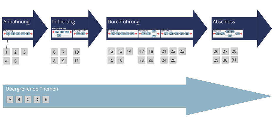 - Die wechselnden Aufgaben und Verantwortlichkeiten in einer Projektphase – z.B. zwischen Vertriebsmitarbeitenden, Projektsponsor und Projektleitung bei der Projektinitiierung – waren schwierig darstellbar.