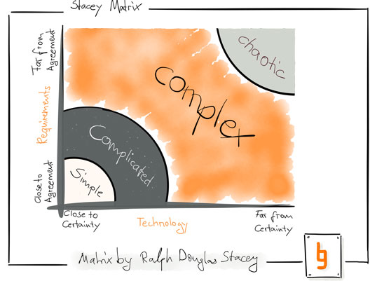 Scrum und andere agile Rahmenwerke sind für Projektsituationen sinnvoll, deren Umfeld ein hohes Maß an Unsicherheit birgt. In solchen Kontexten sind langfristige Pläne wenig zuverlässig. Sehen wir uns Bild 1 an: Geringe Zuverlässigkeit kann sich zum Beispiel ergeben, wenn sowohl die Anforderungen als auch die eingesetzten Technologien unsicher sind (komplexes Projektumfeld). Projekte hingegen, bei denen die Anforderungen und die technologischen Rahmenbedingungen vollständig bekannt sind, lassen sich in der Regel mit hoher Zuverlässigkeit langfristig planen (simples oder kompliziertes Projektumfeld). Solche Projekte können "klassisch" erfolgreich abgewickelt werden.