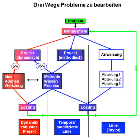 Bei der konventionellen Projektstruktur (temporär modifizierte Linienorganisation) transformiert das Management das Problem in einen Projektauftrag. Das Projekt setzt diesen Auftrag mittels einer passenden Methode um. - Das dynamikrobuste Projekt