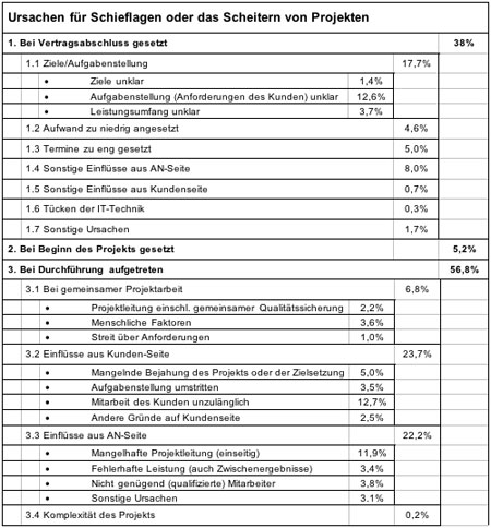Dabei geht es kaum um die vertragsrechtliche Seite. Als Projektverantwortlicher brauchen Sie also weniger einen Rechtsberater für den Abschluss Ihrer Verträge, als jemanden, der eine ordentliche Projektgrundlage schafft, sowie eine Geschäftsführung, die Risiken begrenzen will. Beispielsweise sind zu eng gesetzte Termine (5%) weniger darauf zurückzuführen, dass der Zeitbedarf falsch geschätzt wurde, als darauf, dass der Kunde diese Termine - oft trotz der Bedenken des Auftragnehmers - verlangte und der Auftragnehmer sie letztlich akzeptierte.