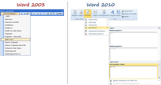 Bild 1: Bis zur Version 2003 ließ sich in Word die Information "Seite x von y" bequem über die AutoText-Funktion einfügen. In neueren Versionen erreicht man diese nur umständlich über vorgefertigte Kataloge.