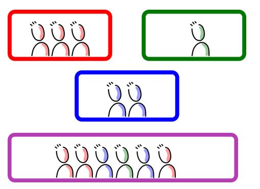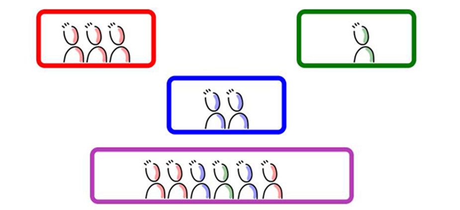 Unterschiedliche Standorte und Kulturen werden durch Farben repräsentiert. Beispielsweise steht rot für den Standort in Deutschland, der Kollege in China wird durch grün symbolisiert und blau steht für einen Standort in den USA. Erschafft man einen virtuellen Raum, an dem für alle die gleichen Prinzipien gelten, mischen sich die Farben, dadurch entsteht ein Purple Space (Bild 1).