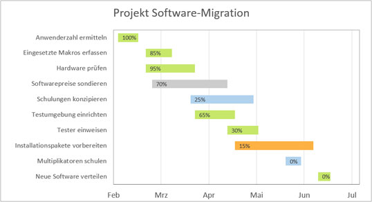 Bild 1: Mit einer Fortschrittsanzeige in jedem der Balkensegmente erhöhen Sie die Aussagekraft des Gantt-Diagramms.