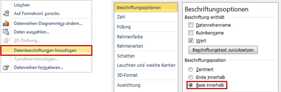 - Klicken Sie als nächstes mit der rechten Maustaste auf eine der Datenbeschriftungen, um alle Elemente der Gruppe zu markieren. Rufen Sie dann mit Strg+1 das Dialogfeld Datenbeschriftungen formatieren auf und wählen Sie bei Beschriftungsposition die Option Basis innerhalb (Bild 3 rechts). Schließen Sie mit OK ab.