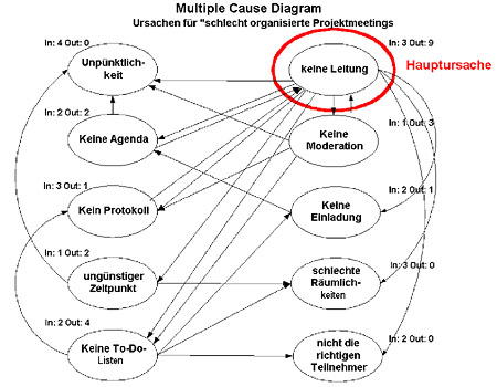 Die Auswertung erfolgt über die Anzahl der eingehenden und ausgehenden Pfeile je Ursache. Bei unserem Beispiel hat die Ursache "keine Leitung" die meisten in- und ausgehende Pfeile erhalten. Somit haben wir den Punkt "keine Leitung" als Hauptfehler-Ursache identifiziert. Hier müssen wir bei der Lösung unseres Problems ansetzen. Die meisten anderen Probleme werden dadurch automatisch gelöst. D.h. wir müssen eine verantwortliche Person für die Projektmeetings bestimmen, dadurch wird es zukünftig eine Agenda geben, es werden Einladungen verschickt, der Zeitpunkt wird zukünftig günstiger gewählt, es werden die richtigen Teilnehmer eingeladen, es wird ein Moderator benannt, es wird Protokoll geführt usw.