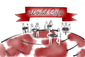 Lösen Sie die Probleme der Welt beim "Kaffeekränzchen"! World Café ist ein kreativer Ansatz zur Ideenfindung in Großgruppen: In entspannter Atmosphäre tauschen die Teilnehmer in wechselnden Untergruppen an Stehtischen ihr Wissen aus.