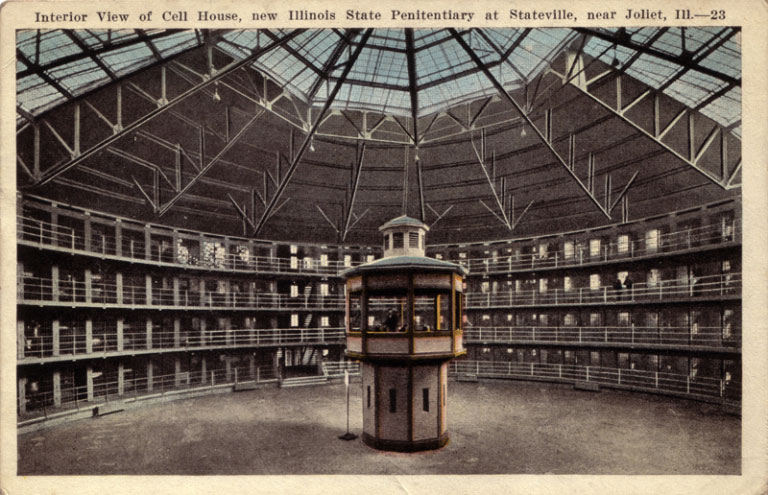 Bild 1: Postkarte eines amerikanischen Panopticons, Text: "Interior view of cell house, new Illinois State Penitentiary at Stateville, near Joliet, Ill." Quelle: Eingescannte Postcarte aus der Sammlung von Alex Wellerstein, gefunden auf www.prisonphotography.org