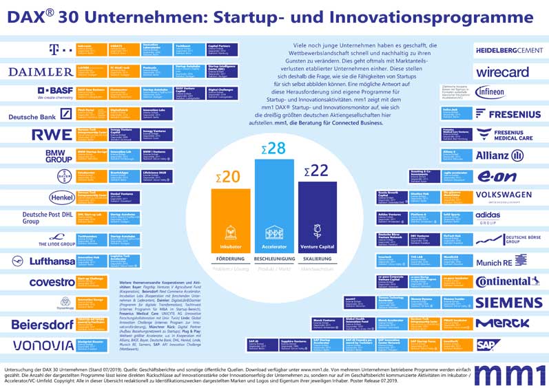 Zum anderen, weil junge Unternehmen in rasanter Geschwindigkeit auch die klassischen Märkte erobern und die Etablierten diese neuen Möglichkeiten nutzen wollen, statt überholt zu werden. Bild 1 liefert einen Überblick der Programmlandschaft der 30 DAX-Unternehmen (Stand: Juli 2019).