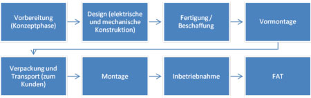 Bei einem mittelständischen Entwickler und Hersteller von Produktionsanlagen begleiteten meine Kollegen und ich 2007 die Einführung von Critical Chain Projektmanagement. In diesem Unternehmen gliedert sich ein Projekt typischerweise in die Phasen Vorbereitung, Design, Fertigung/Beschaffung, Vormontage, Verpackung und Transport, Montage, Inbetriebnahme und Final Acceptance Test (FAT) (Bild 1).
