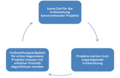Diese Situation des Anlagenherstellers ist typisch für die Arbeit in einer Multiprojektumgebung mit komplexen Projekten. Mitarbeiter, die Projekte vorbereiten, befinden sich in einer ewigen "Aufholjagd". Da Projekte begonnen wurden, die nicht vollständig vorbereitet waren, müssen die noch fehlenden Vorbereitungen mit hoher Priorität abgeschlossen werden. In der Folge ist keine Zeit vorhanden, die Vorbereitungen für die Projekte durchzuführen und abzuschließen(!), deren Start unmittelbar bevorsteht. Auch hier sind nach Projektstart wiederum dringende Arbeiten erforderlich, welche die Mitarbeiter erneut davon abhalten, bevorstehende Projekte vorzubereiten. Ein Teufelskreis (Bild 2).