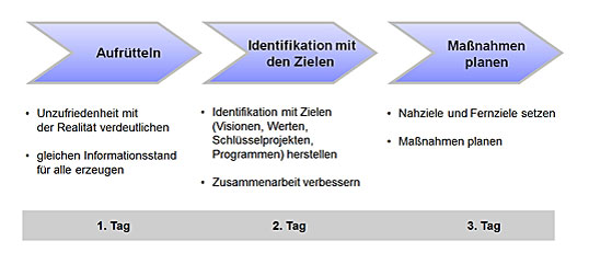 • Am zweiten Tag sollen die Teilnehmer für die Veränderung motiviert werden. Dabei richtet sich der Blick auf die Zukunft und die Situation nach der Veränderung.