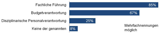 Die zumeist leitende Funktion wird auch durch die wahrgenommenen Verantwortungsbereiche bestätigt (Bild 4). So verfügen 85% über eine fachliche Führungsverantwortung, 67% über Budgetverantwortung und 25% über disziplinarische Personalverantwortung. Lediglich 8% der Studienteilnehmer gaben an, keine dieser Verantwortlichkeitsbereiche zu bekleiden.