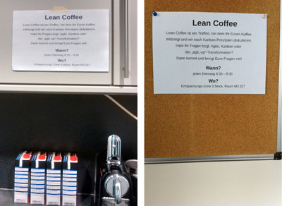 Da die Einladungen von möglichst vielen gelesen werden sollen, hängt man diese am besten an stark frequentierten Orten aus, z.B. in der Kaffeeküche bei der Kaffeemaschine, am Schwarzen Brett oder an Durchgangstüren in den Fluren (Bild 2). Im Gegensatz zu formellen Meetings erfolgen keine direkten persönlichen Einladungen, z.B. per E-Mail.