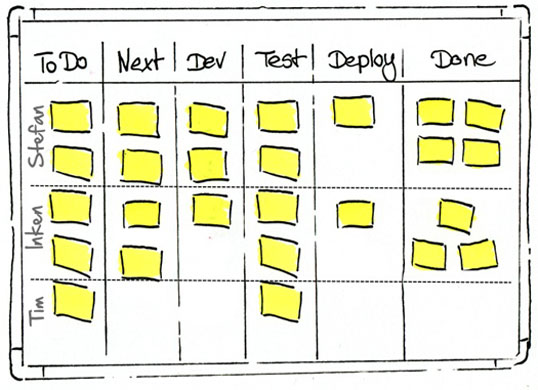 Er nahm Schwamm und Whiteboard-Marker und änderte das Board-Design. Die "Swim Lanes" für die einzelnen Kollegen waren jetzt verschwunden. Stattdessen hatte er durch Avatare visualisiert, wer gerade an welcher Aufgabe arbeitet. Aufgaben, die noch nicht begonnen waren, wurden auch noch keiner Person zugeordnet.