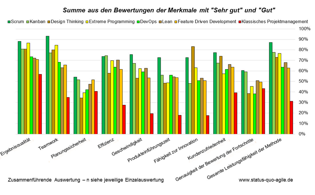 Wie erfolgreich agile Methoden in der Praxis sind, aber auch wie agile Methoden in der Praxis gelebt werden, zeigt die Studie "Status Quo Agile" (Komus, A. et al.; Status Quo Agile, 2016). Diese ermittelte Ende 2016 zum dritten Mal die Verwendung und den Erfolg agiler Methoden in der Unternehmenspraxis. Dazu wurden über 1.000 Teilnehmer aus 30 Ländern befragt. Die Studienergebnisse zeigen unter anderem zweierlei: