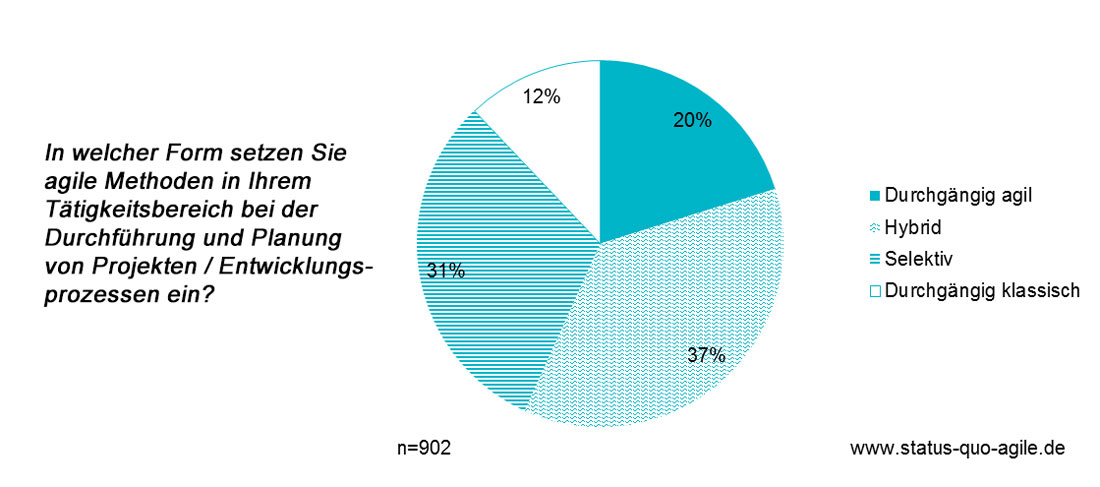 Folgt man verschiedenen Publikationen aus dem agilen Umfeld, entsteht der Eindruck, dass hybride oder selektive Formen der Nutzung kaum möglich oder zumindest nicht empfehlenswert seien. In der Praxis ergibt sich jedoch ein anderes Bild: Hybride oder selektive Anwendungsformen sind nicht nur durchaus vertreten, sondern stellen sogar eine deutliche Mehrheit dar. Mehr als zwei Drittel der Studienteilnehmer wenden agile Methoden hybrid oder selektiv an – dreimal so viel wie "rein agil" arbeiten.