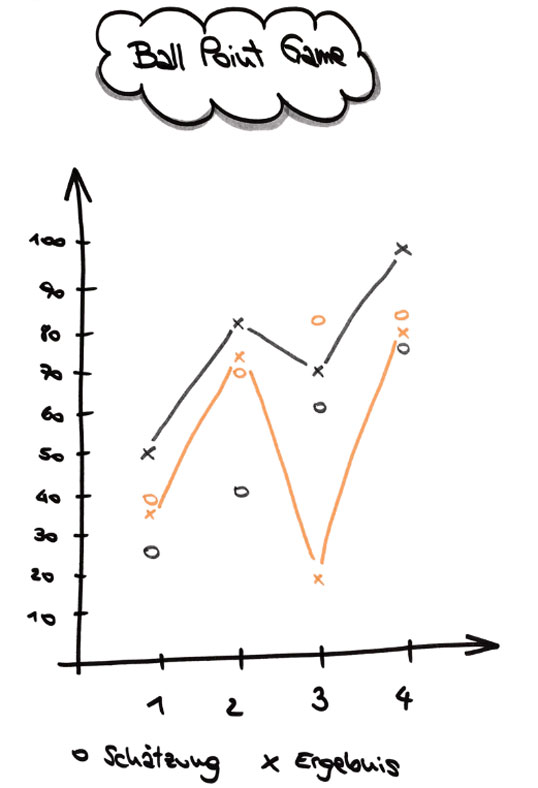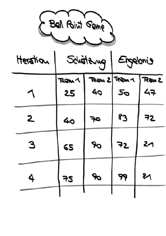 Auf einem Flipchart vermerkt der Moderator in jeder Iteration die Schätzungen der Teams und ihre Ergebnisse, also die Anzahl der durchgeschleusten Bälle. Das kann entweder in Form einer Tabelle (Bild 1) passieren oder in einer Grafik (Bild 2), welche die Teilnehmer selbst ausfüllen. Die Tabelle besteht aus drei Spalten: "Iteration", "Schätzung" und "Ergebnis". In jeder Zelle können dann die Schätzungen und Ergebnisse pro Team, eventuell in unterschiedlichen Farben, eingetragen werden (siehe Bild 2).