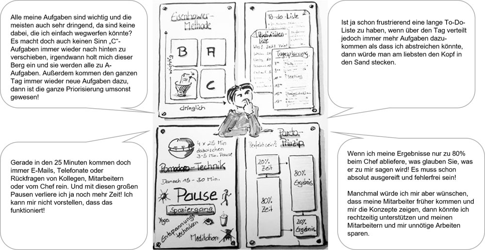Mit den Rückfragen beginnt die Steuerung und Korrektur der verschiedenen Projekte, auch wenn er selbst nicht mehr direkt in der fachlichen Umsetzung involviert ist. Durch die ständigen und nicht kalkulierbaren Unterbrechungen verschoben sich seine eigentlichen Aufgaben immer mehr auf den Abend und aufs Wochenende. Langsam verließen Sven seine Kraft und Souveränität. Er war unkonzentriert und vor allem: genervt. Jede Rückfrage empfand er als Störung und seine Reaktionen fielen zunehmend negativ für seine Mitarbeiter aus. Nachdem die ersten Feedbacks seiner Mitarbeiter und Vorgesetzten ihm aufzeigten, dass es so nicht weiterging, begann er, sich intensiver mit Zeitmanagement- und Selbstorganisationstools zu beschäftigen – jedoch ohne den erhofften Erfolg.