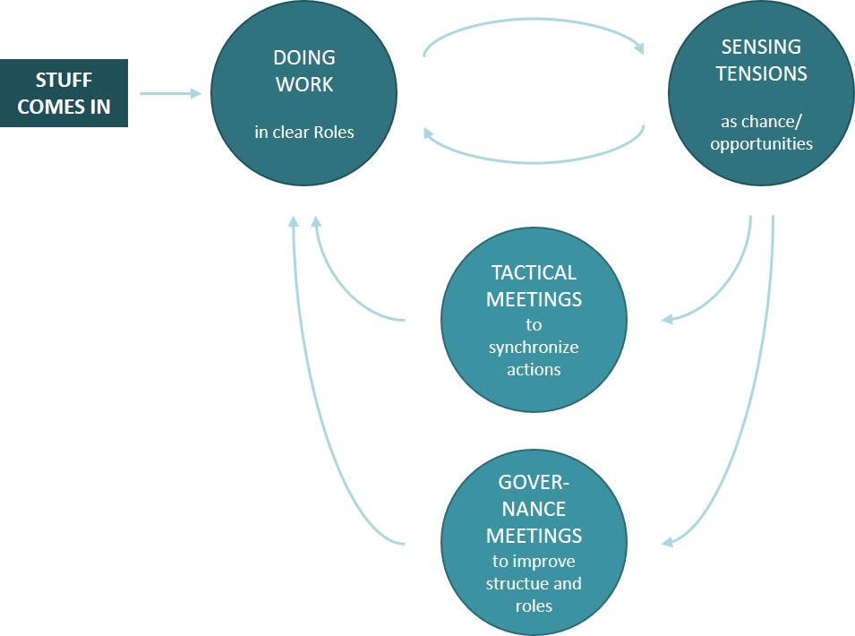 "Arbeit im System" wird durch verschiedene, klar beschriebene Rollen ausgeführt. Treten Probleme oder Unstimmigkeiten auf (im Holokratie-Kontext werden diese als "Tensions", also Spannungen, beschrieben, z.B. zwischenmenschliche Konflikte, Wünsche zur Verbesserung eines Prozesses oder Anregungen zu einem bestimmten Thema) können diese – je nach Hintergrund – im Tactical oder dem Governance Meeting geklärt werden. Innerhalb beider Meetings trifft sich der gesamte Kreis – also alle Rollen, die einem Kreis zugeordnet sind (siehe auch Bild 2).